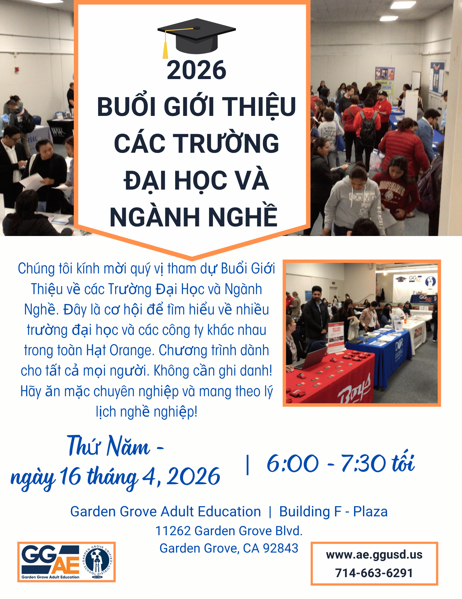 2026 College & Career Fair: Thursday, April 16, 2026 (6:00-7:30PM), Garden Grove Adult Education (Building F-Plaza)